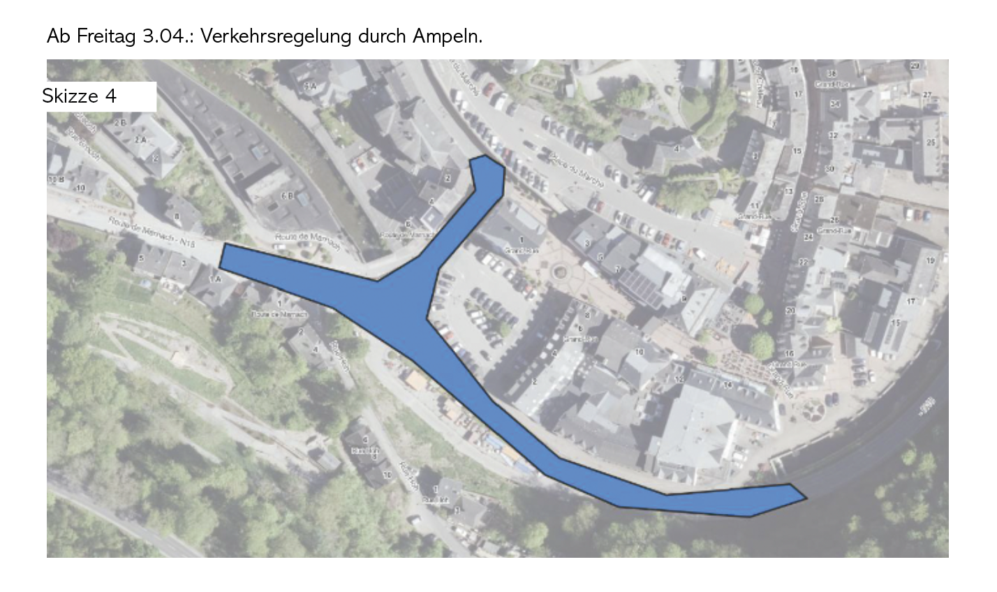 Du jeudi, 19.03 au vendredi, 03.04 : ⚠️ Fermeture complète du contournement reliant la Place de la Libération à la Place Benelux (zone indiquée en orange – esquisse 3). L’accès via la route de Marnach sera ouvert à la circulation.